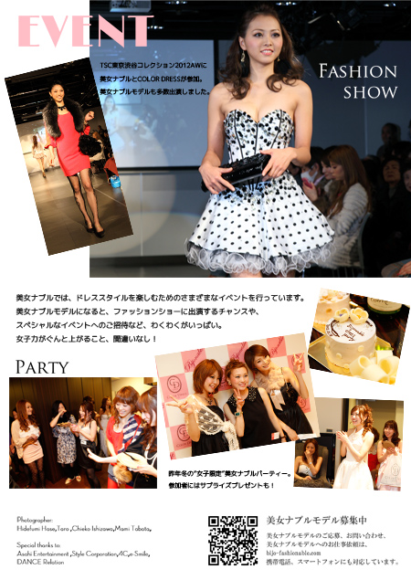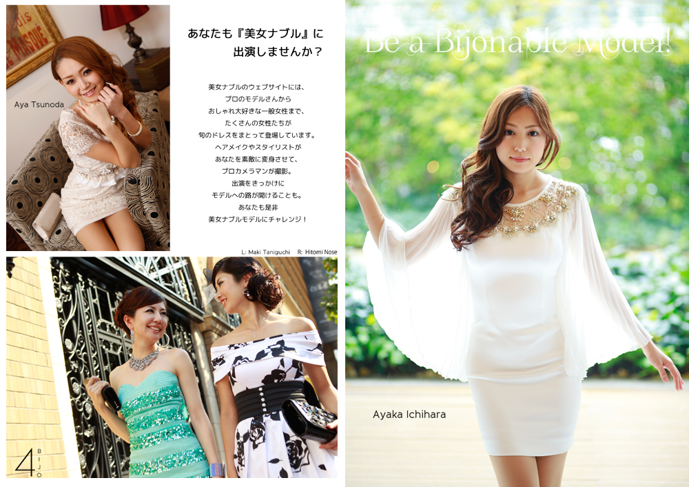また、美女ナブルでは、関連プロダクションや、日本の代表的なドレスブランド、ファッション・ビューティー企業、メディアなどからのお仕事のオファーを受けておりますので、皆さんのモデルとしての活躍を可能なかぎりサポートします。 |
